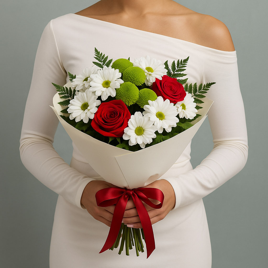 Яркий контраст красных роз и белоснежных хризантем с изумрудной зеленью создаёт праздничное настроение и подойдёт для любого торжества. Этот букет наполнен символикой любви, чистоты и искренних чувств.